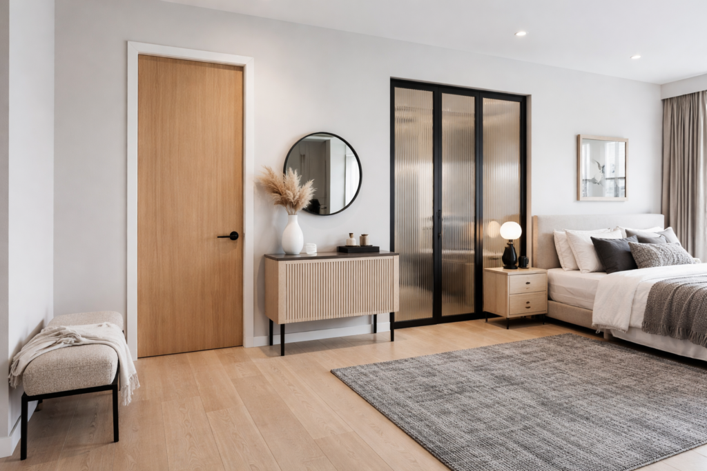 A sleek bedroom door design can change the first impression completely. Flat-panel wood doors, taller doors, reeded glass closet doors, or matte hardware make the room feel more considered.