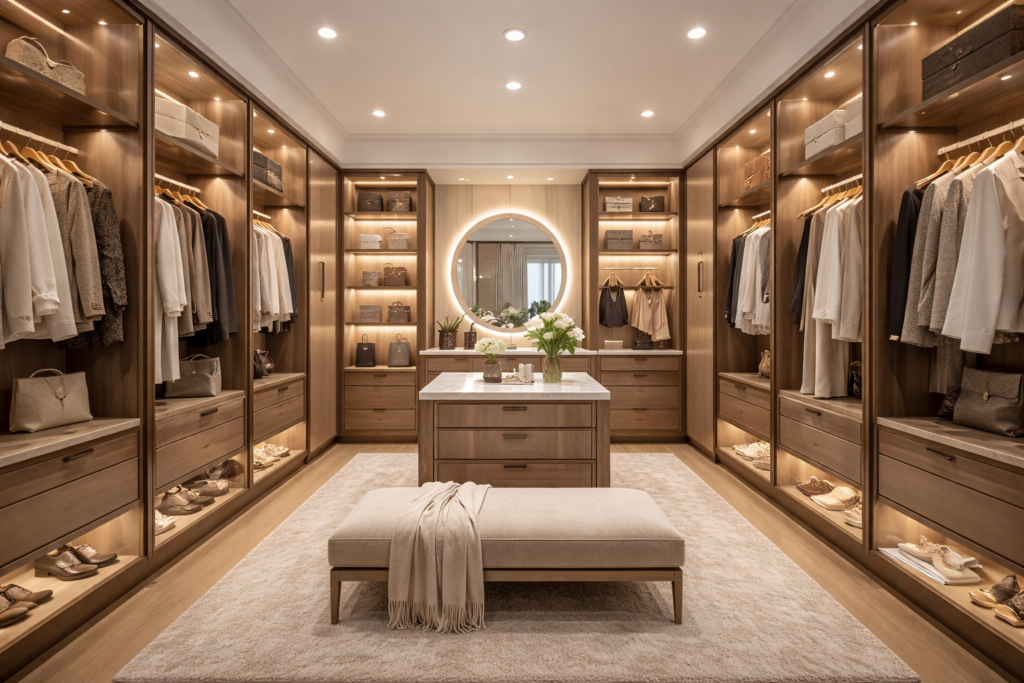 A bedroom with walk-in closet layout plan or luxury bedroom with walk-in closet always feels more premium when the closet looks designed, not leftover. Add warm lighting, matching hangers, mirror panels, and closed storage to keep it neat.