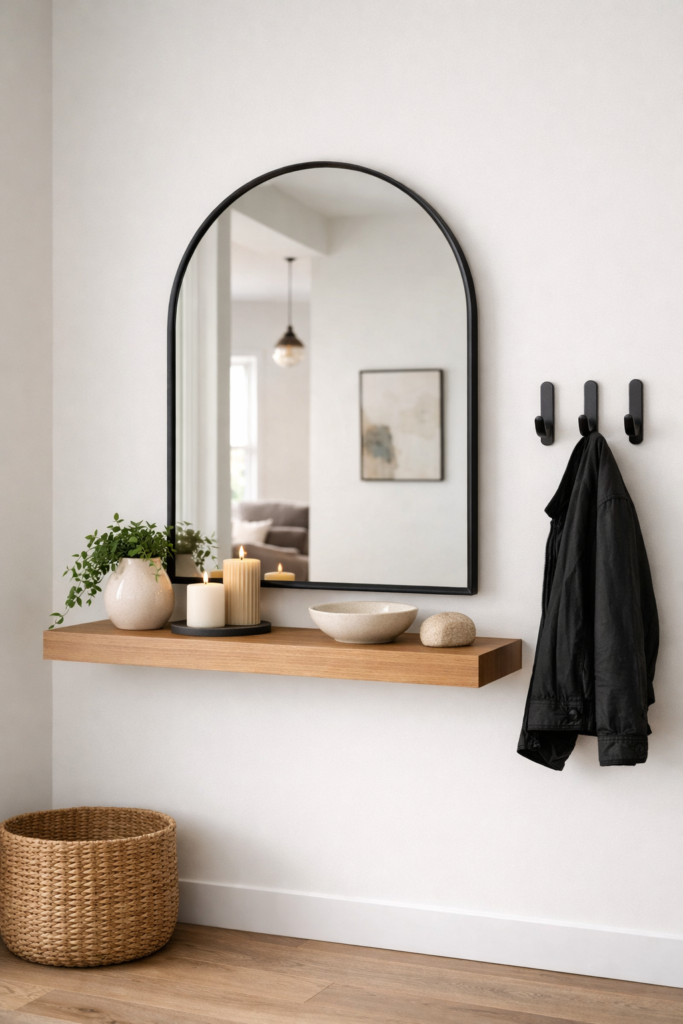 One of the biggest 2026 trends is the sleek Entry Wall With Mirror paired with a floating shelf. This minimalist setup works beautifully in both a Modern Apartment Entrance and larger homes.