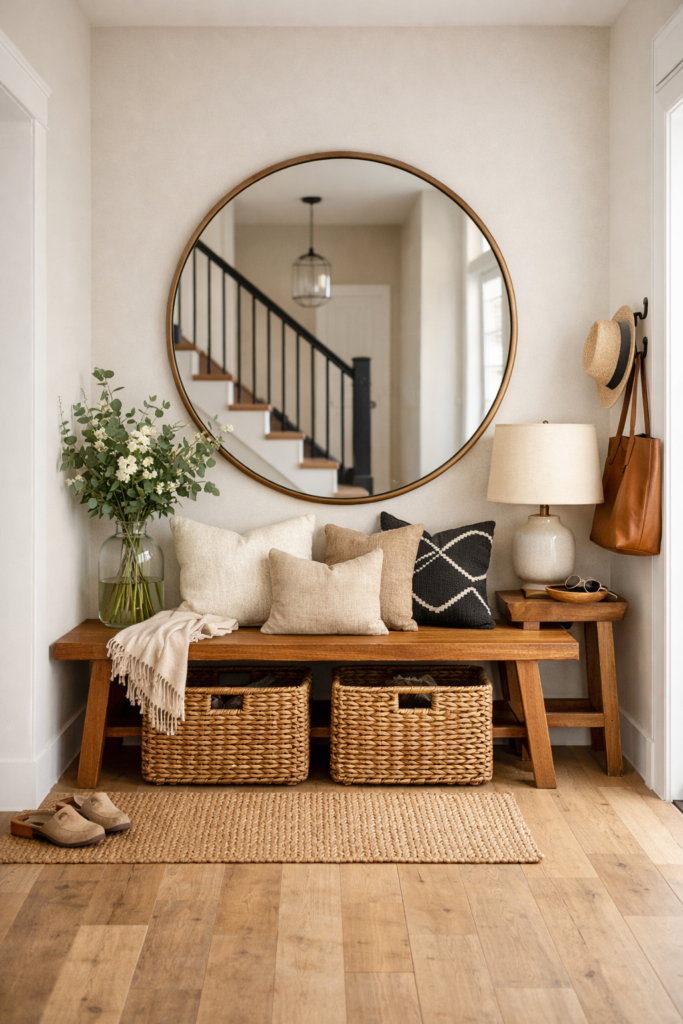 The Entry Way Bench And Mirror combination is timeless and trending again in 2026. A Front Hall Bench Entryway adds comfort and charm while improving Foyer Organization Entryway functionality.