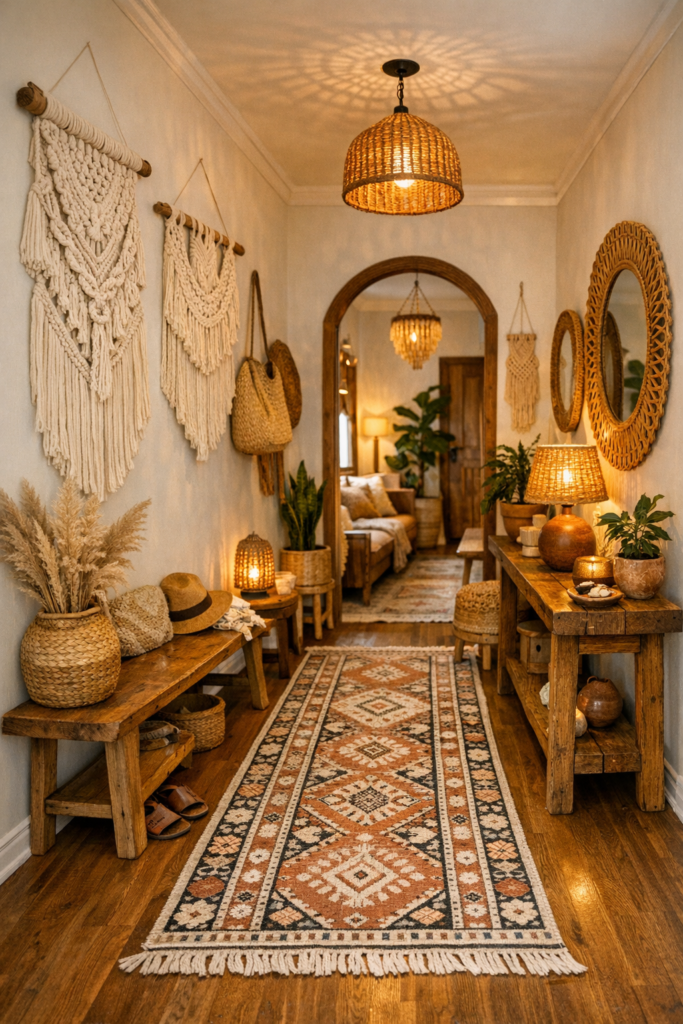 The Bohemian Hallway Decor trend continues strong in 2026. A layered, artistic approach makes your Hall Entryway Ideas feel creative and warm.