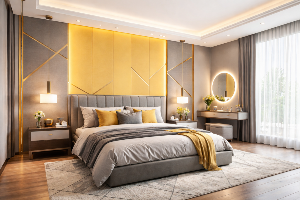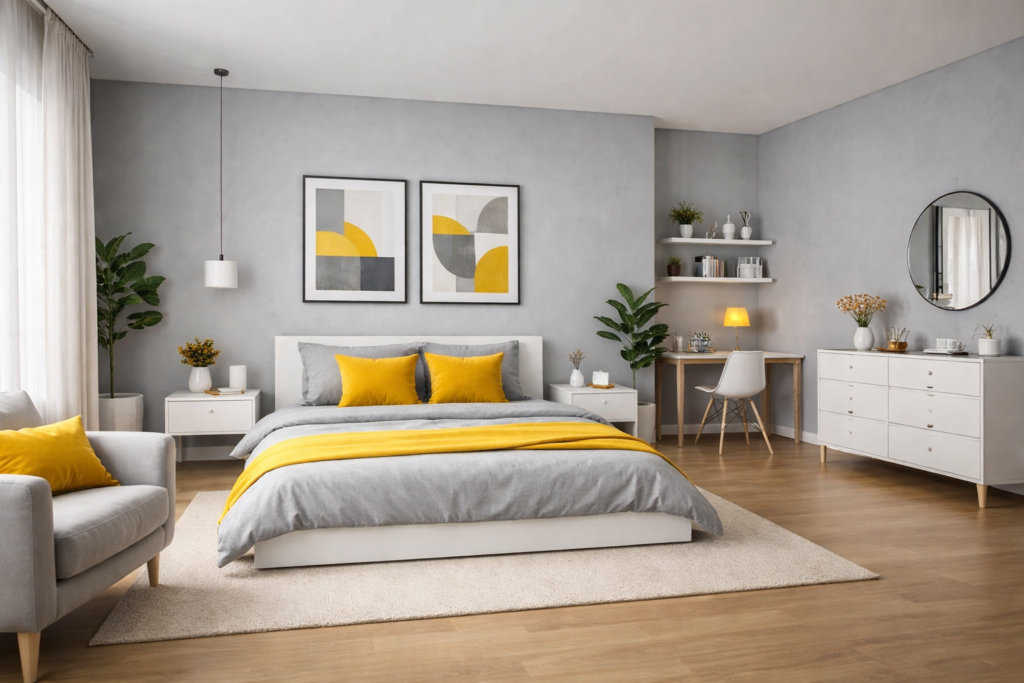 One of the easiest ways to achieve a fresh bedroom look is by combining grey walls with yellow accents. This approach works beautifully for Modern Home Interior Design Bedroom layouts and contemporary spaces.