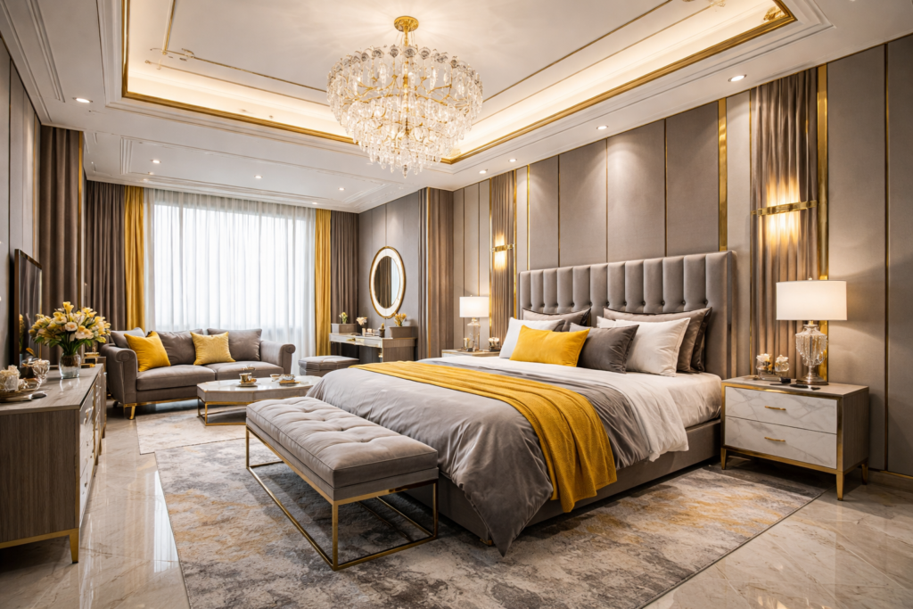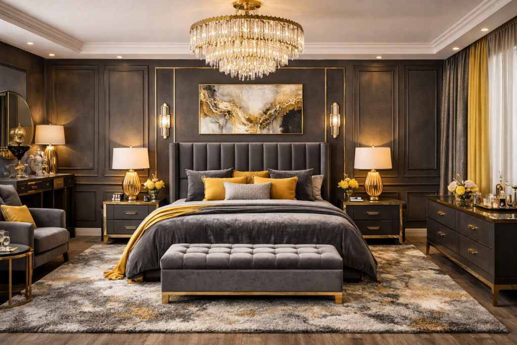 If you want something elegant, combine darker greys with warm golden-yellow details. This creates a luxurious atmosphere perfect for Luxury Bedroom Master interiors.