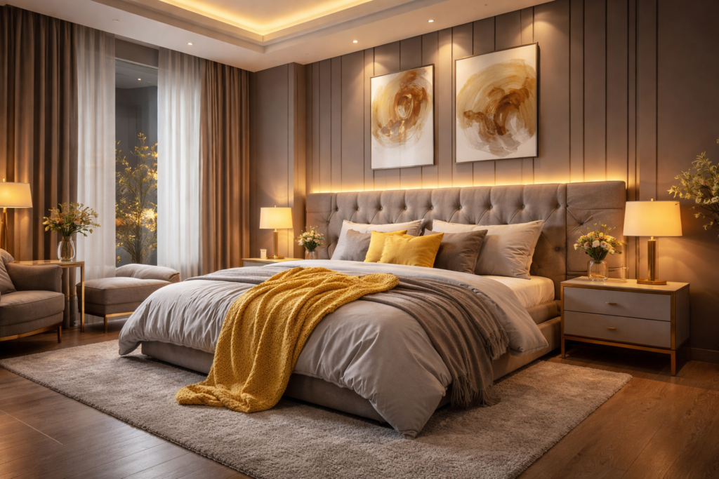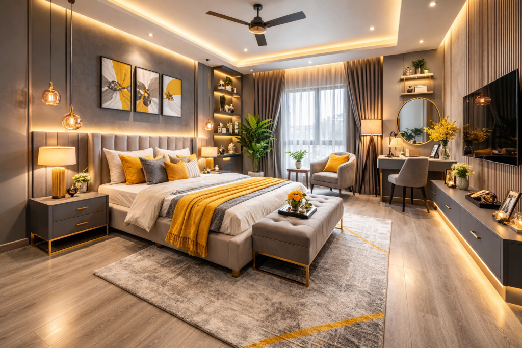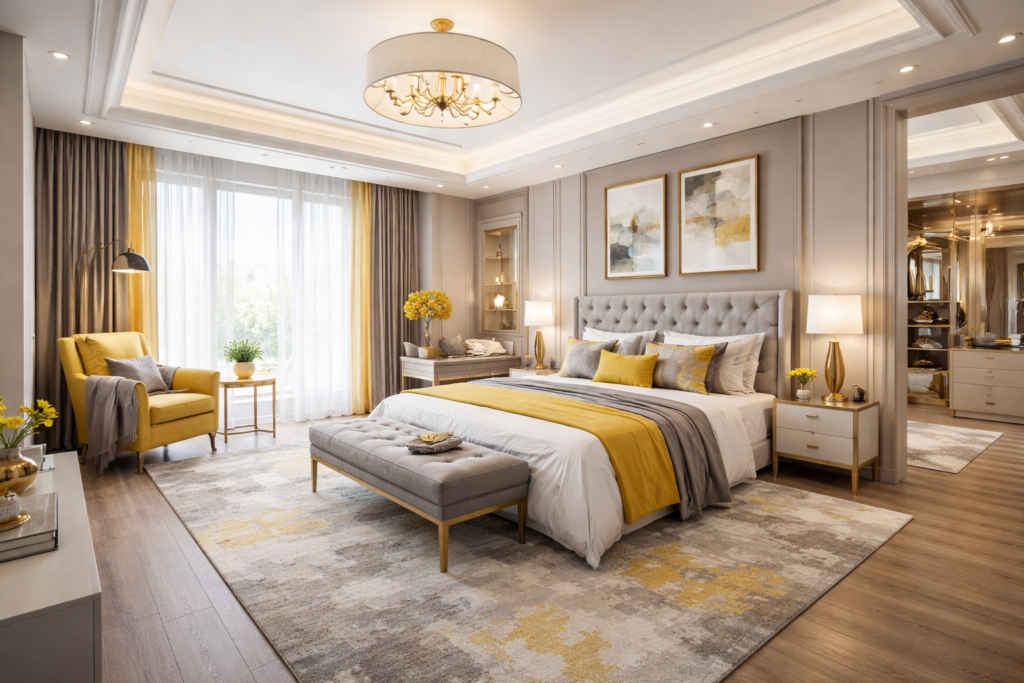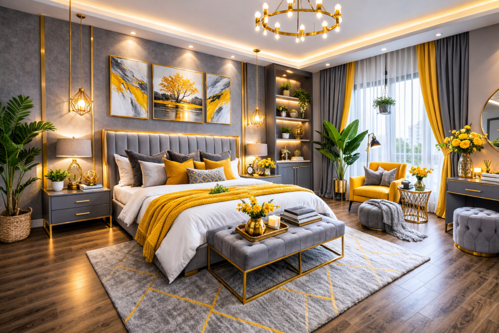 Grey and yellow is a timeless color combination that works beautifully across many bedroom styles—from Modern Bedroom Interiors to cozy farmhouse retreats and luxurious master suites.