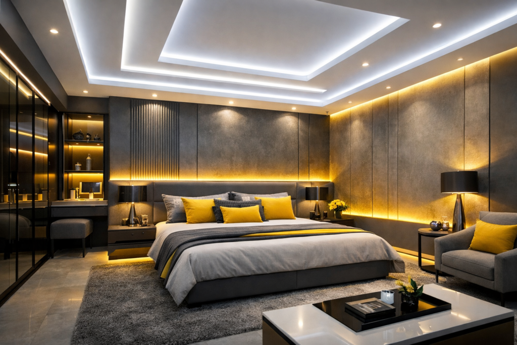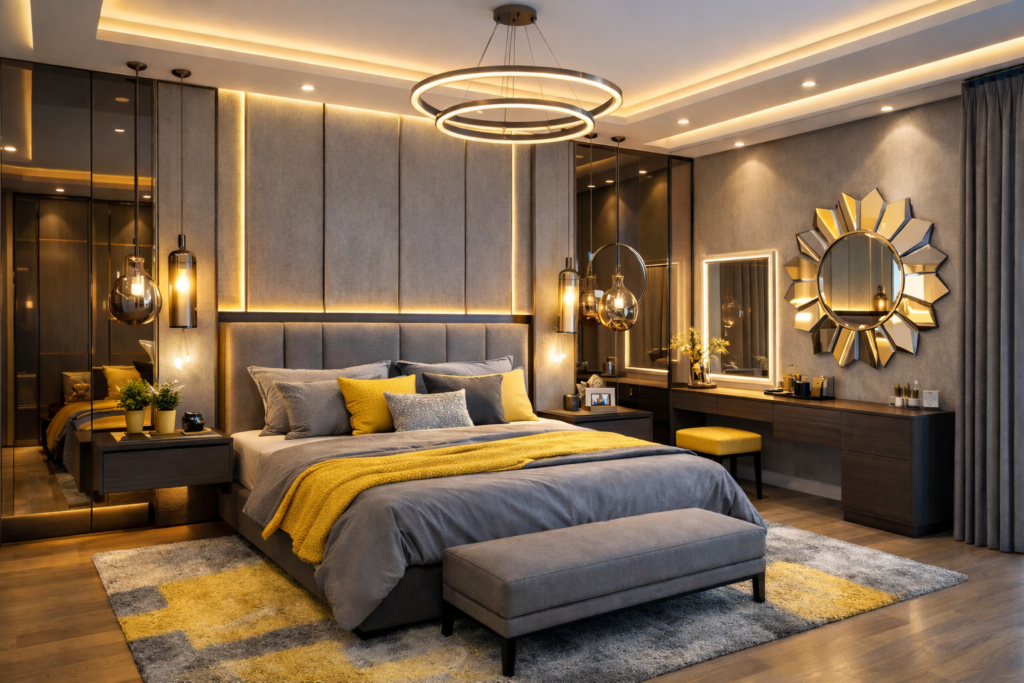 Grey and yellow is one of the most refreshing color combinations for modern bedrooms. Grey adds elegance and calmness, while yellow introduces warmth, brightness, and energy. Together, they create a balanced palette that works beautifully in Modern Bedroom Interiors, cozy couple spaces, and even luxury master suites.