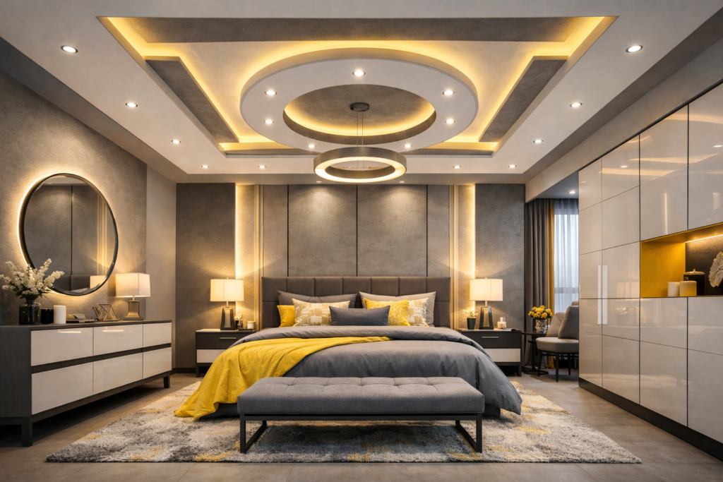 5. Grey Yellow Bedroom with Stylish Ceiling Designs