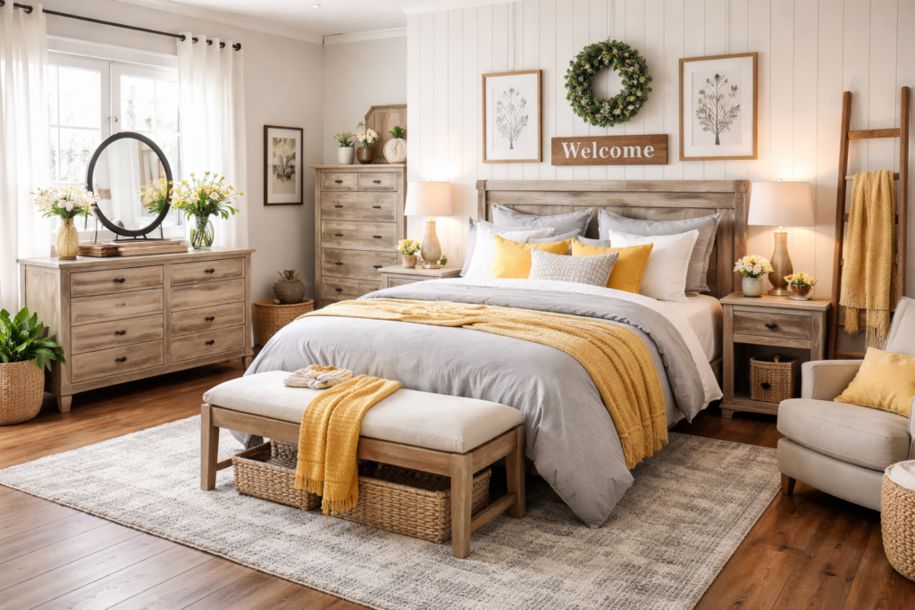 If you love rustic charm, a grey and yellow Modern Farmhouse Bedroom is a fantastic option.