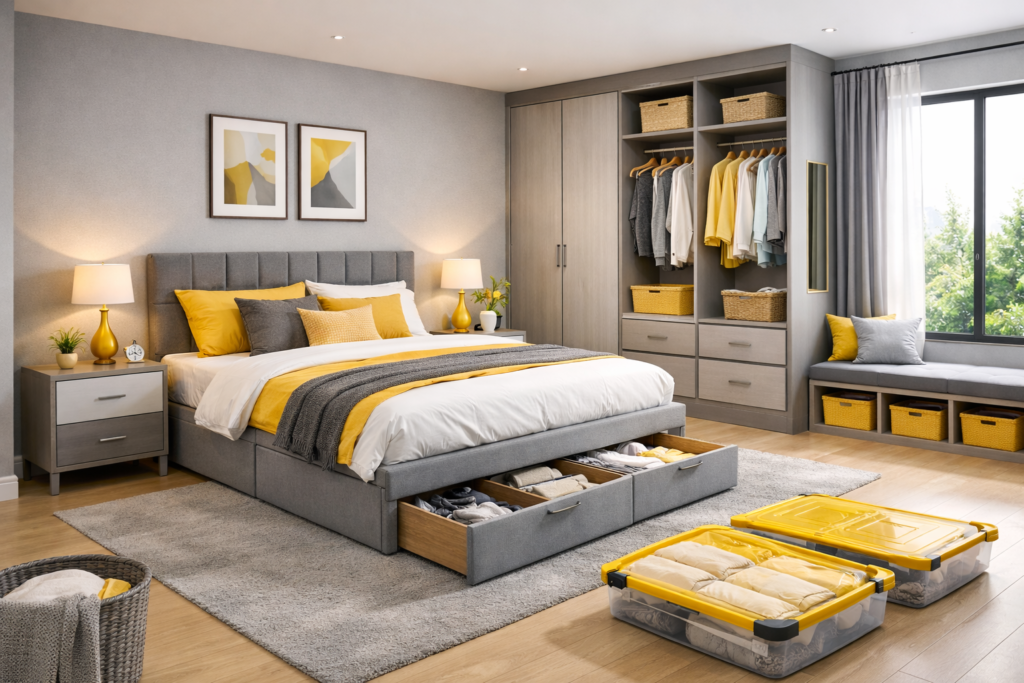 Smart storage makes a bedroom both stylish and practical. Incorporate functional furniture for a well-organized Interior Bedroom layout.