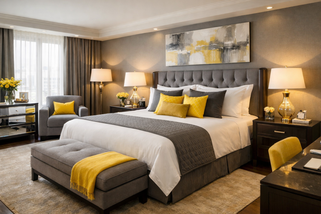 A grey and yellow Guest Room Luxury design feels welcoming and stylish.