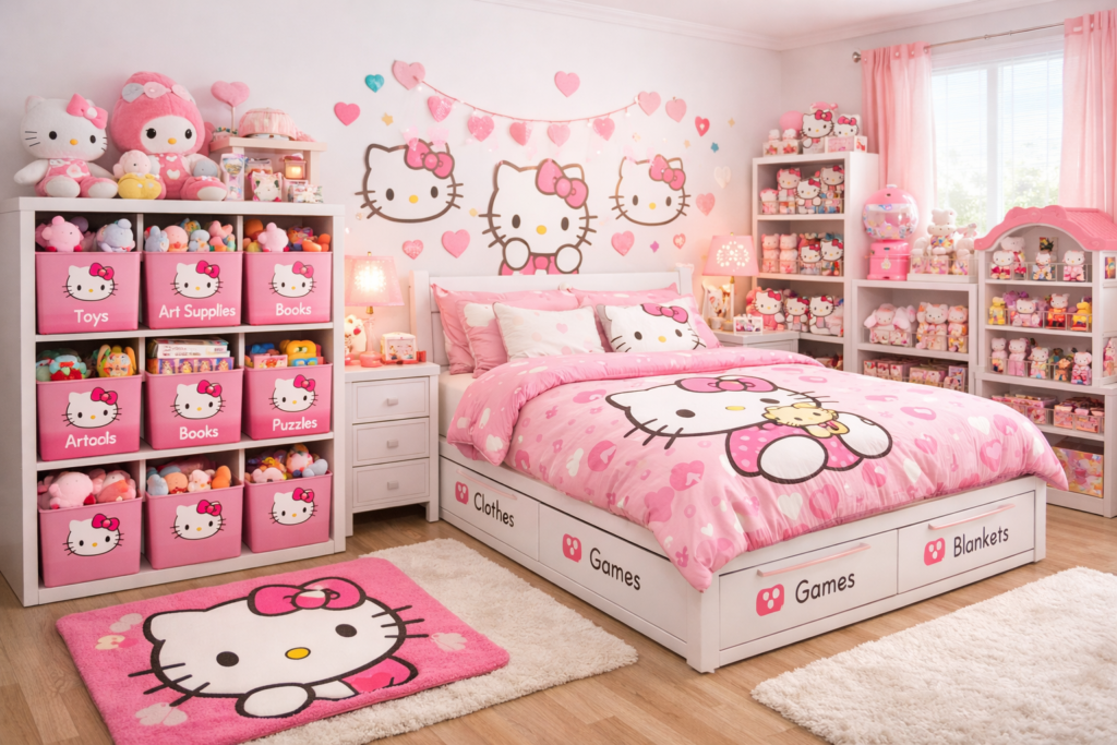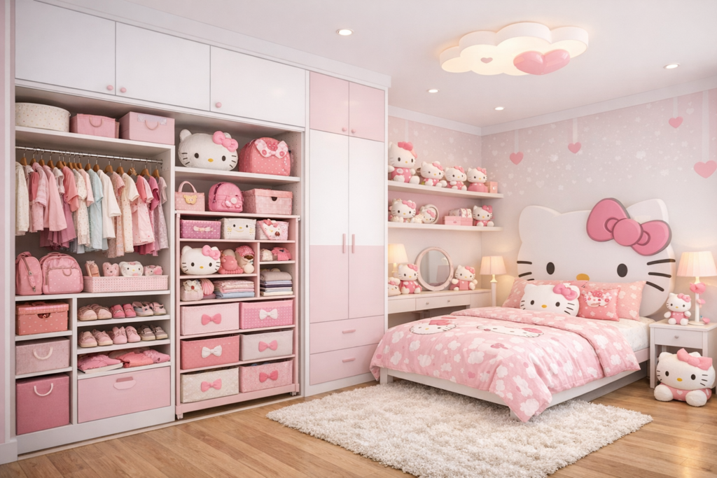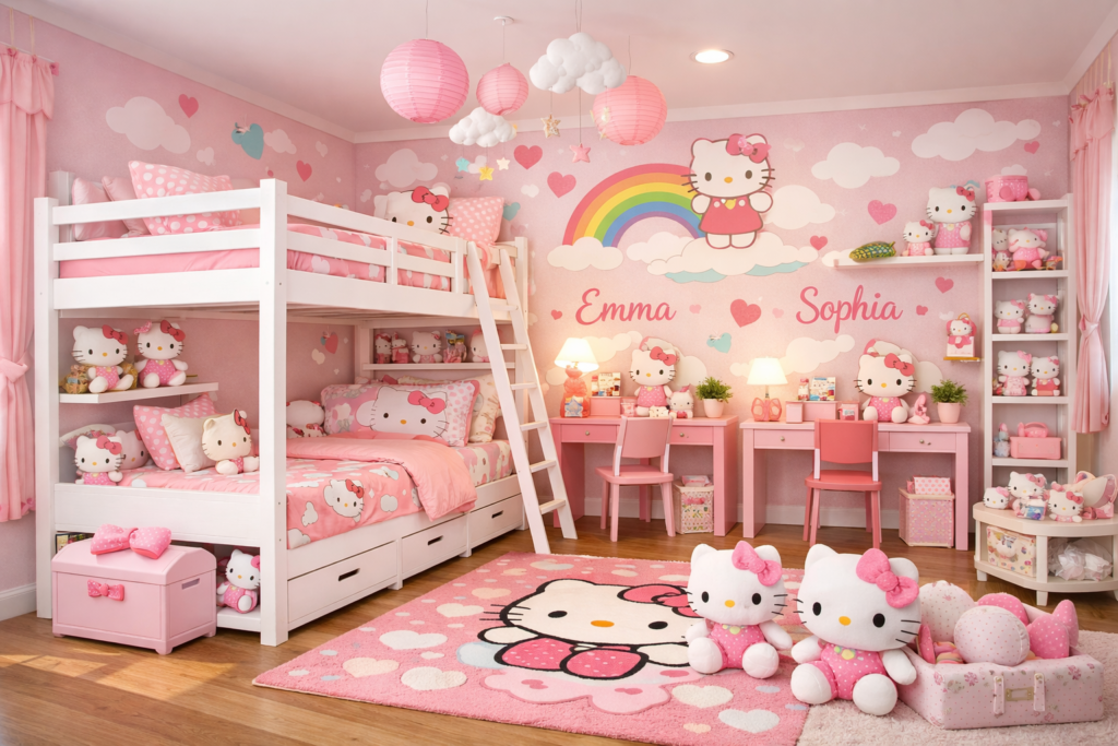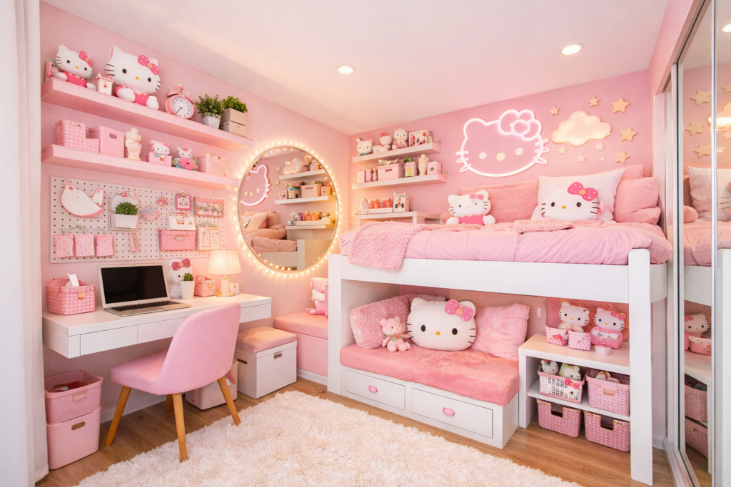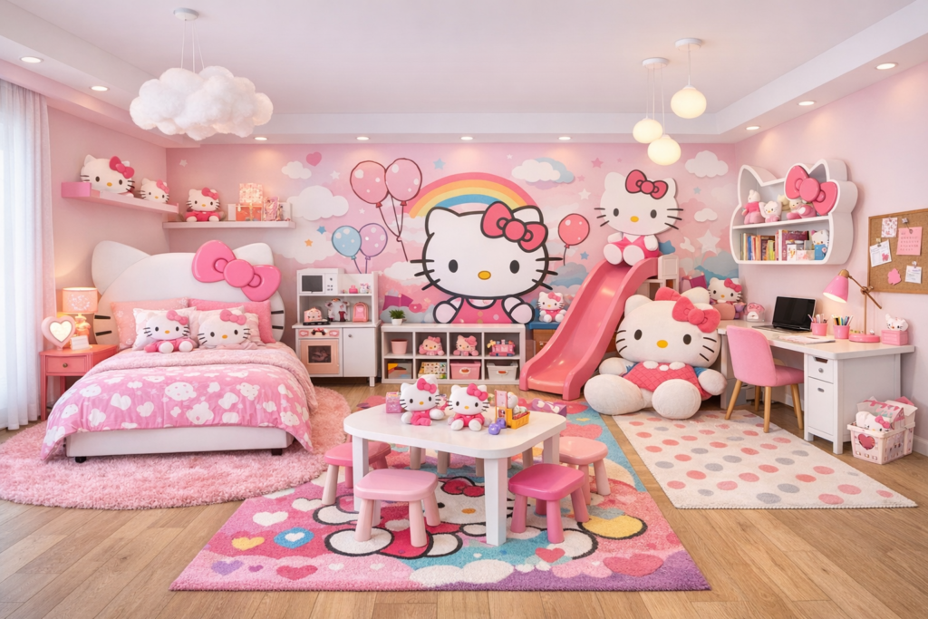 Designing a Hello Kitty bedroom doesn’t have to mean overwhelming pink overload or cluttered decor. With the right balance of creativity and planning, you can create a stylish, modern, and functional kids’ space that still feels magical. Whether you’re working with a tiny room or designing a dreamy playroom-bedroom combo, these ideas will help you build a space your child absolutely loves 💖