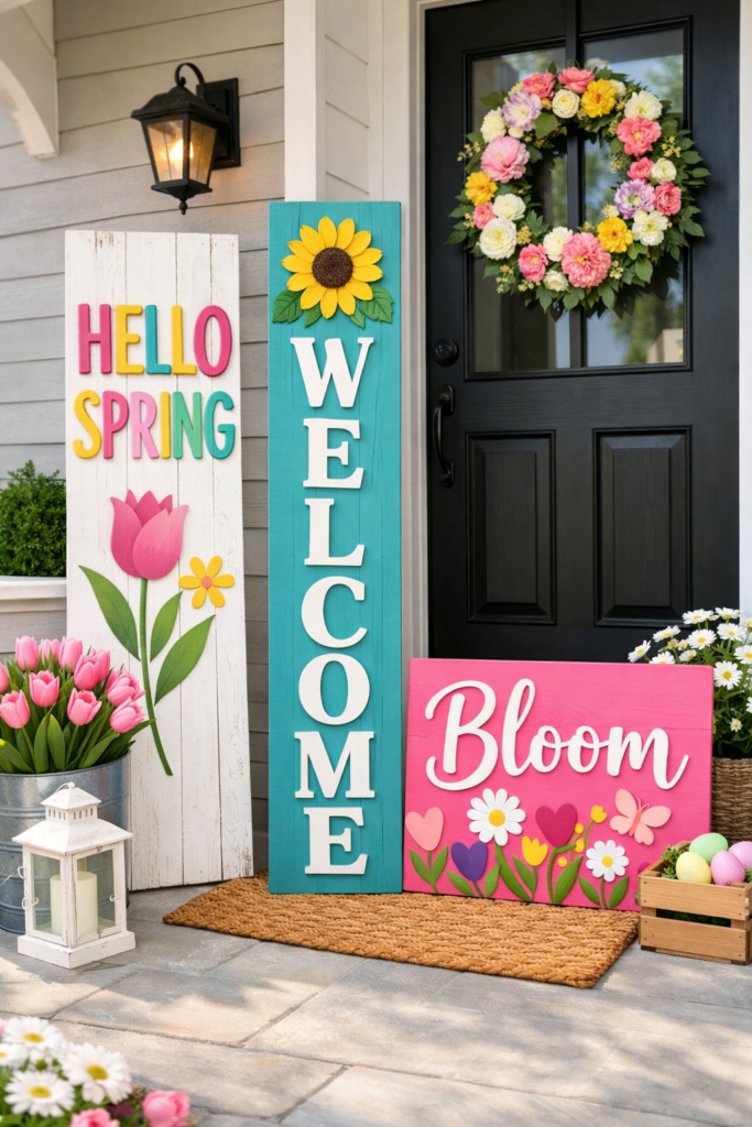 For a more rustic look, try a farmhouse-style sign like a Hello Spring Sign or Fresh Flower Market board.