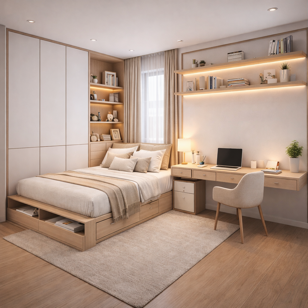 Multifunctional spaces are essential in modern homes. A small room with bed and desk layout is perfect for:
