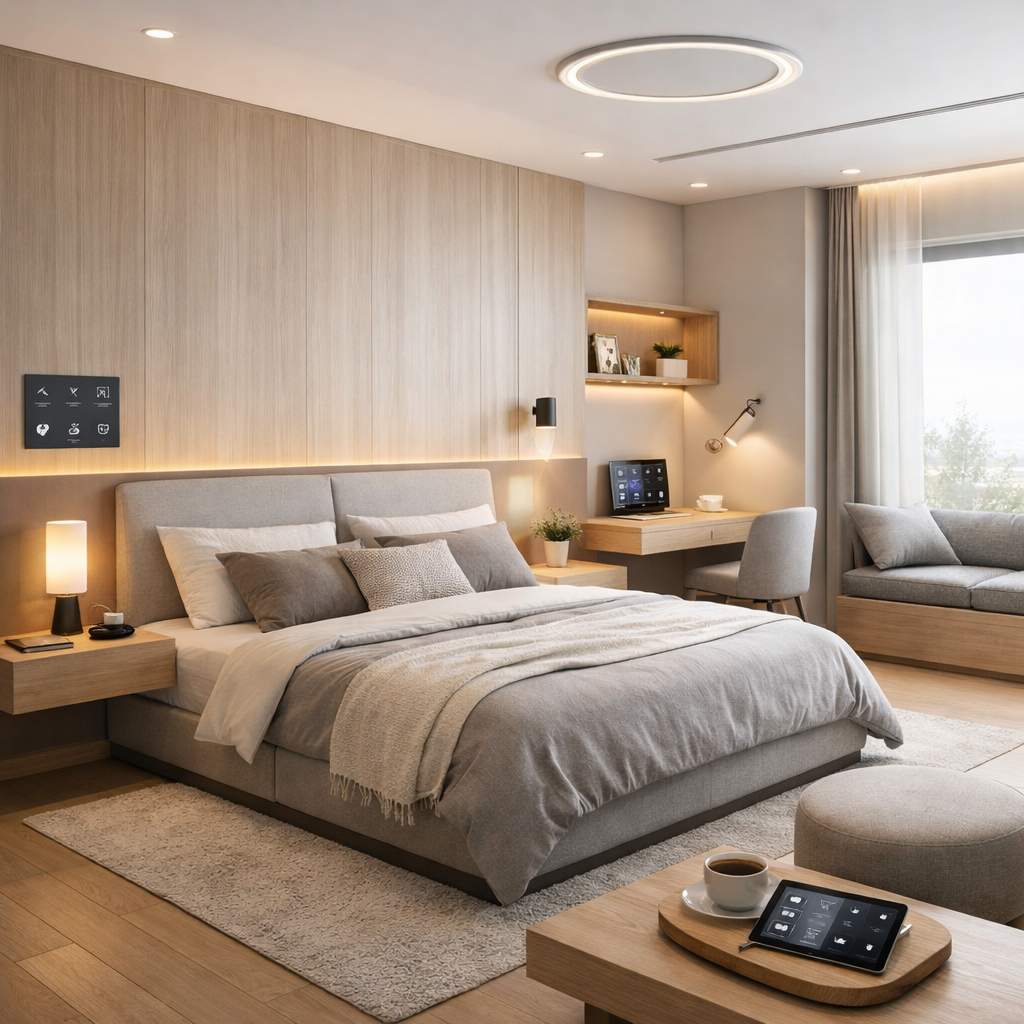 Compact desks, wall-mounted shelves, and minimal furniture help maintain balance between rest and productivity.