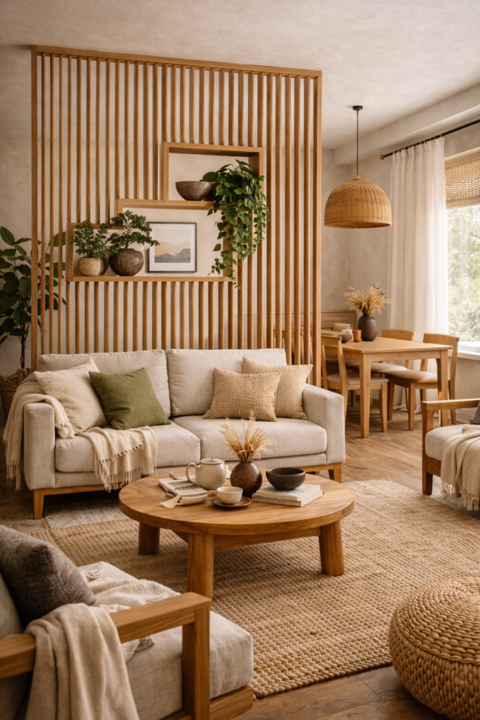 Open-plan living can sometimes lack coziness. Japandi uses partitions to define zones without closing off light or space. Living room division ideas can be both functional and artistic. A wood partition modern living rooms adore, made of thin oak or ash slats, subtly separates a dining area while allowing light to filter through. For a botanical touch, a modern wooden room divider with plants incorporates built-in shelves for trailing pothos or a small bonsai. Clever small living room divider ideas, like a low cabinet or a sheer fabric panel, can create an entrance and living room divider, offering a gentle transition. This Japandi living room partition technique brings intention to your layout.