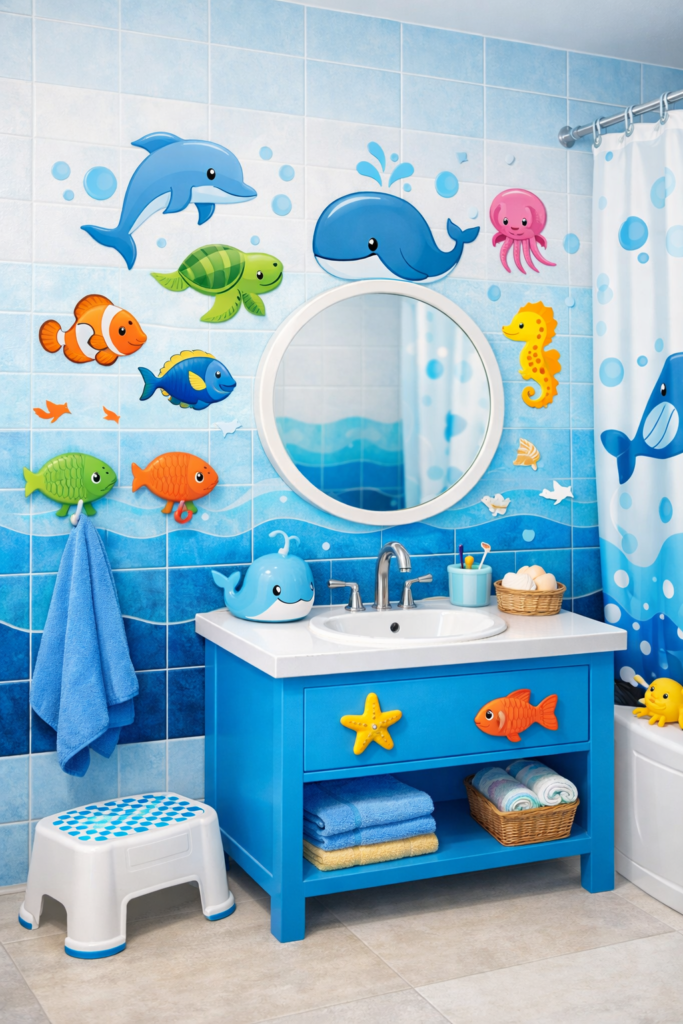 Kids love themed bathrooms, and an ocean theme is a fantastic Bathroom Inspiration Decor idea. A calming blue palette creates a refreshing environment while encouraging bath time fun.