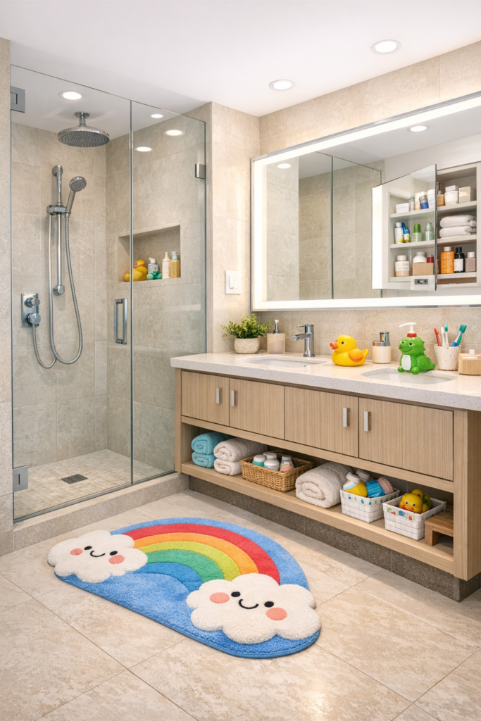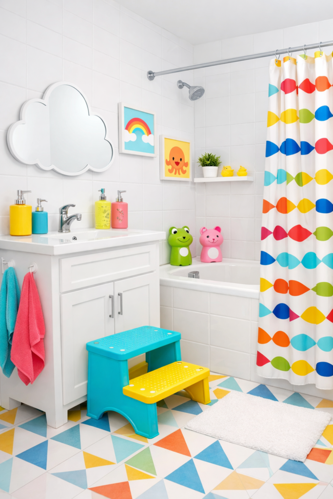 Then add fun items like colorful bath mats or themed soap dispensers to keep the space child-friendly.