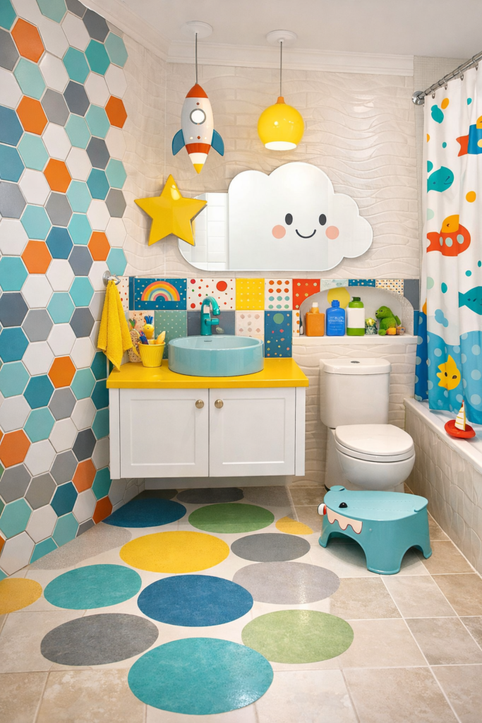 Adding playful colors and shapes makes the bathroom visually stimulating for kids while maintaining a Basic Bathroom Design structure.
