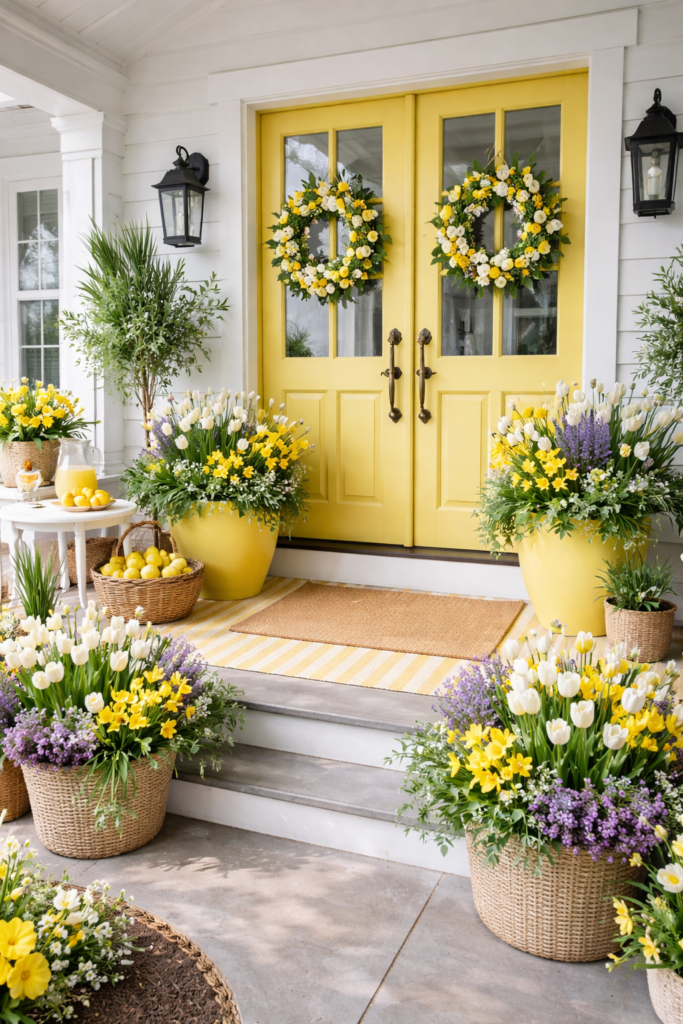 9. Front Porch Planter Ideas Spring with Lemon Colors 🌼🍋