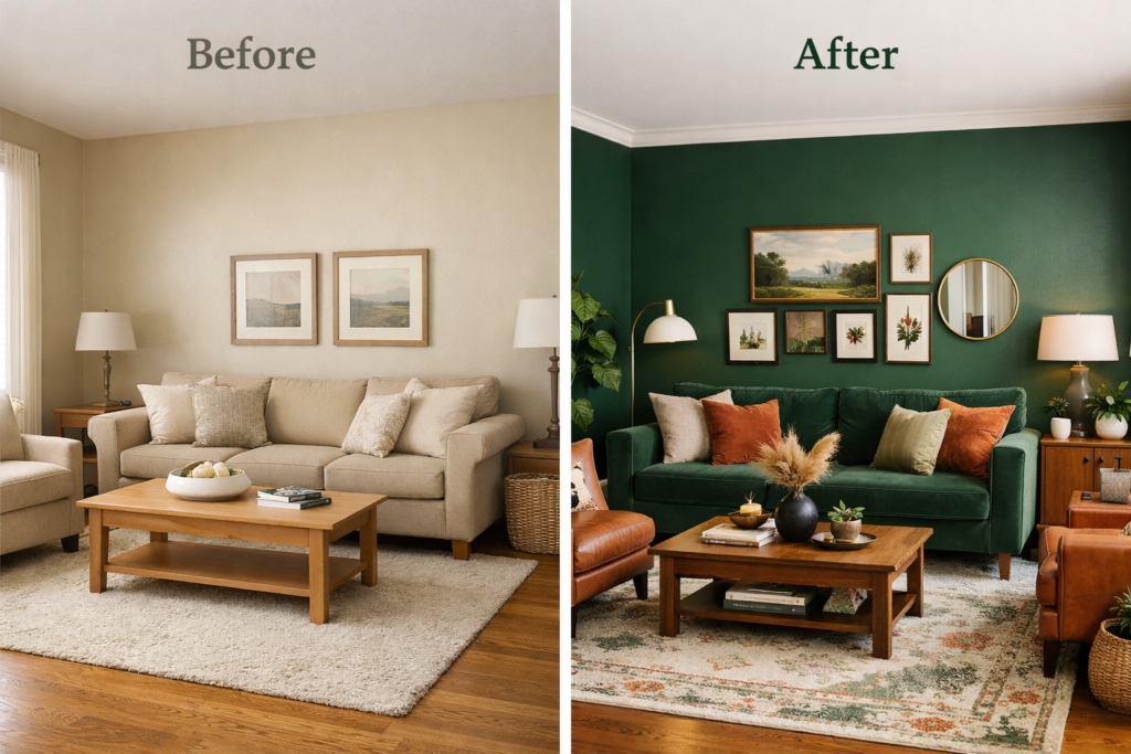 After: A rich Green Paint For Living Room Walls paired with carefully selected Furniture For Green Walls introduced warmth and depth. Thoughtful Interior Color Options and creative Painting Combinations For Walls created a dramatic contrast.