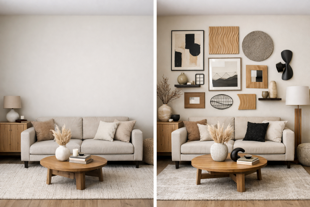After: A curated gallery wall combined with textured finishes and bold art pieces brought personality into the space. Incorporating Modern Wall Decor Ideas instantly elevated the design.