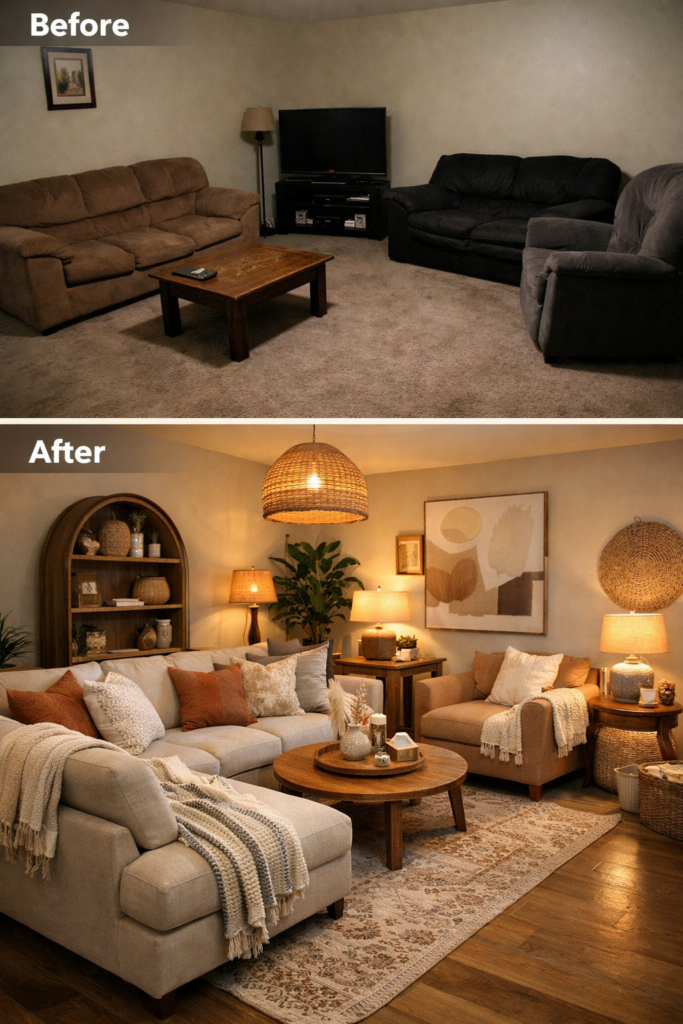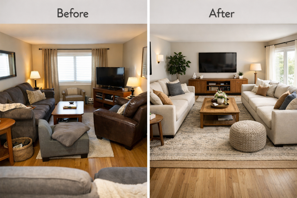 After: A carefully planned Living Room Floorplan maximized comfort and movement. A well-scaled Living Room Big Couch, defined seating zones, and balanced spacing made the room feel twice as large.