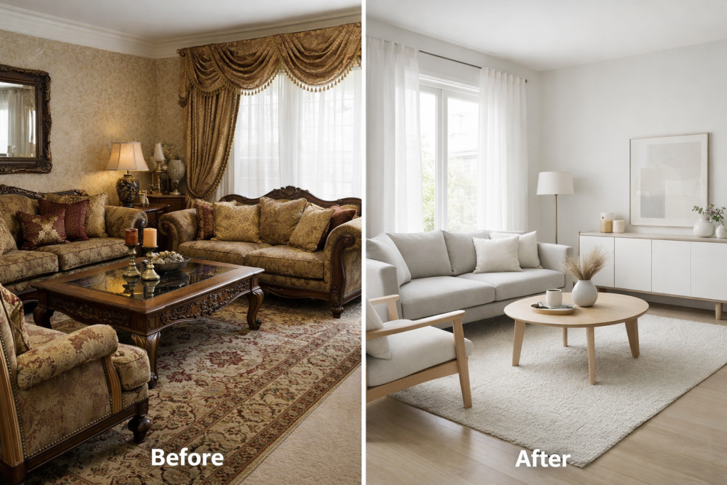After: A refined Chic Minimalist Living Room design introduced sleek furniture, soft textures, and open space. Inspired by Modern Scandinavian Living Room Minimalist styles, the room now feels airy and calming.