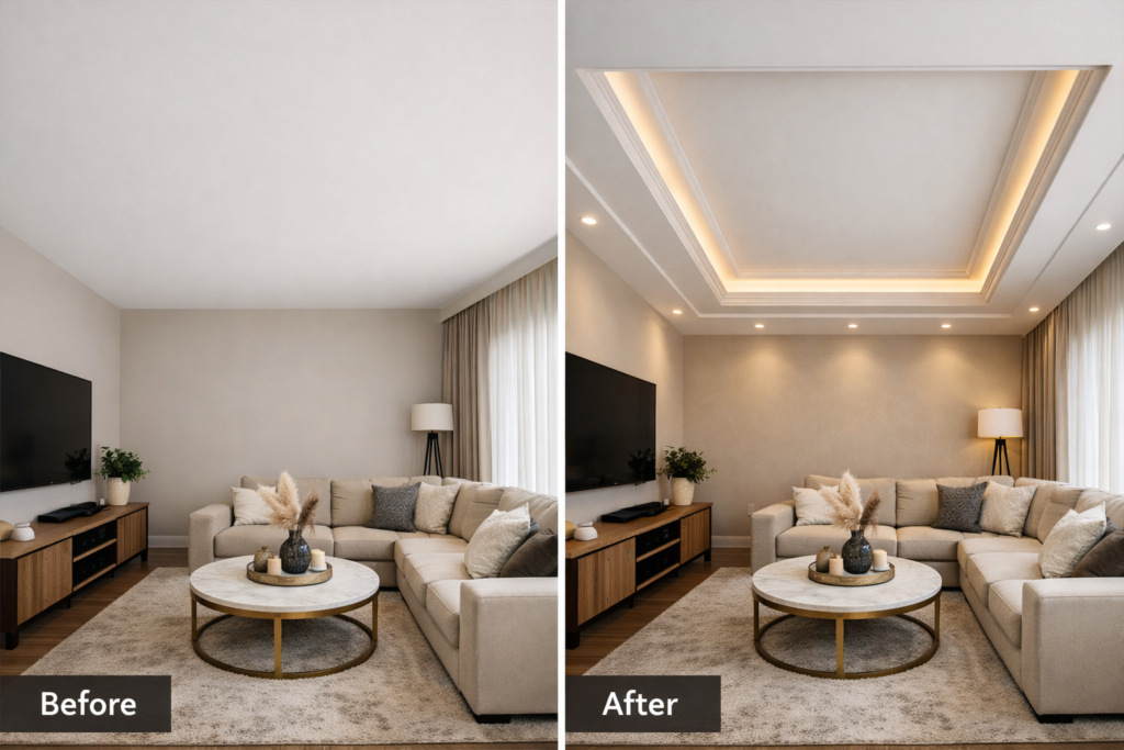 After: Installing a tray ceiling with integrated LED strips transformed the room. A stylish Ceiling Design Living Room detail enhances vertical dimension and sophistication.