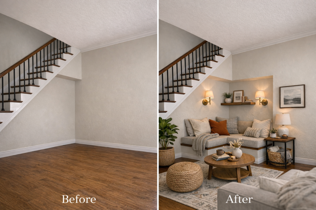 14. Empty Corner to Functional Living Room Near Stairs 📚