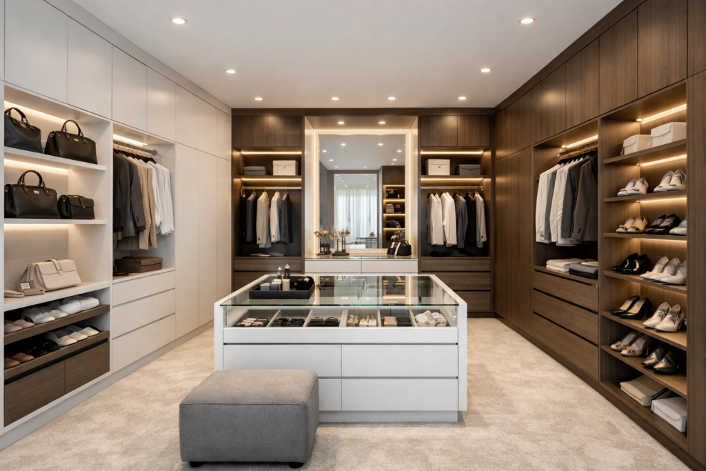 A truly elegant dressing room design focuses on symmetry, premium finishes, and thoughtful detailing. Incorporate luxury wardrobe interior design elements like polished wood, glass panels, and soft-close drawers to elevate your space instantly.