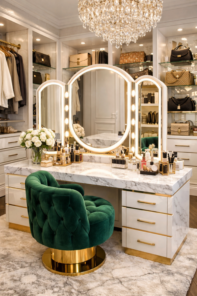 A vanity is essential for a complete transformation. Explore dressing room vanity luxury ideas with marble tops and velvet seating.