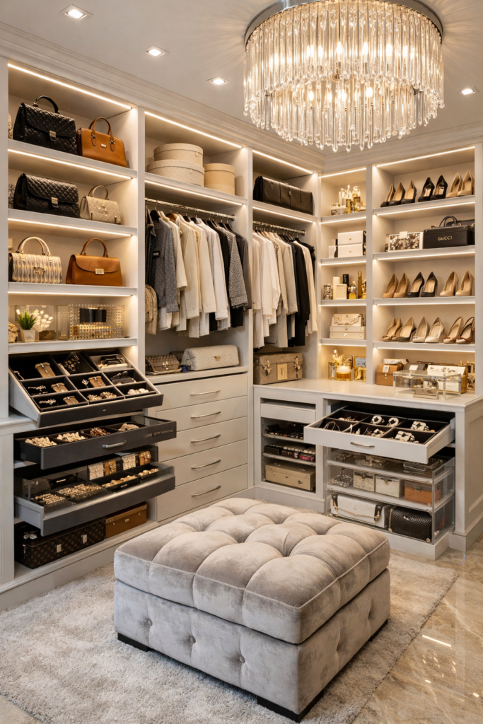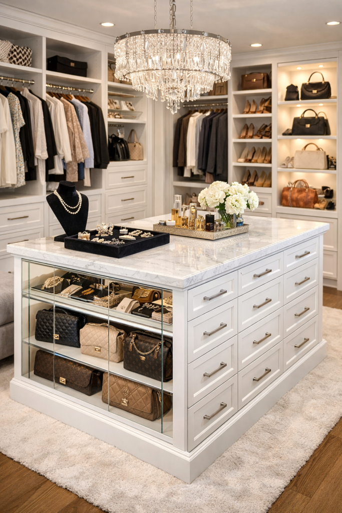 A central island adds both storage and sophistication. Consider luxury closet island ideas with drawers and display sections.