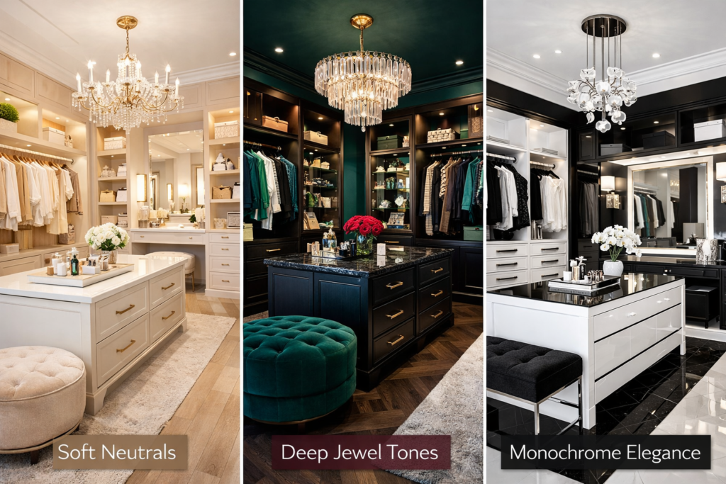 Your color palette defines the vibe. Popular luxury dressing room color schemes include: