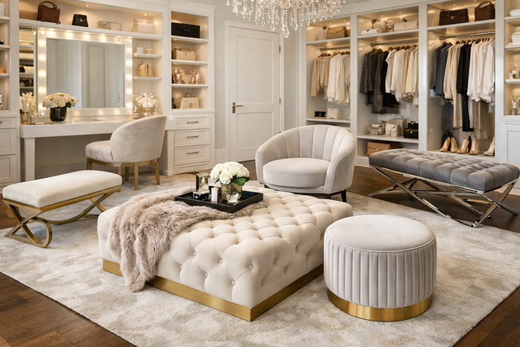 Furniture defines comfort. Invest in luxury dressing room furniture like ottomans, benches, and seating.
