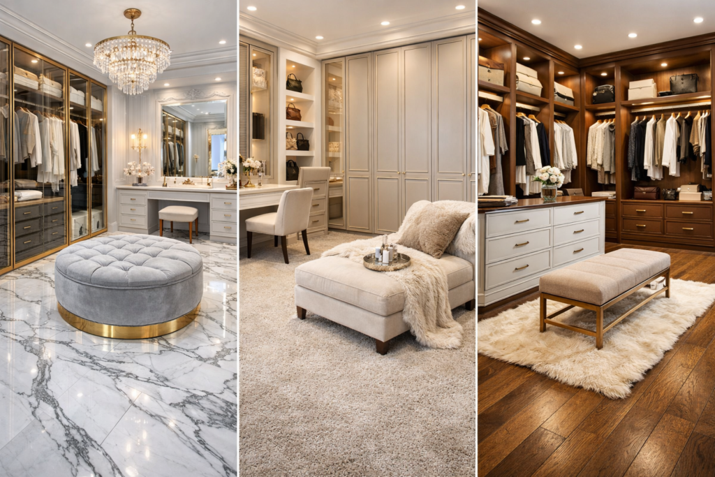 These luxury dressing room flooring ideas enhance the overall aesthetic.