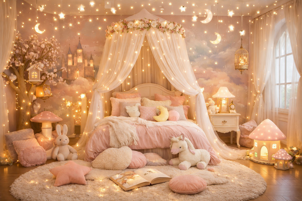If your child loves fantasy, this is where dreams come alive. A fairy tale kids bedroom combines soft lighting, pastel tones, and whimsical details.