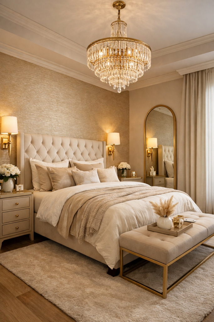 Beige is back. But not the flat, boring beige from the early 2000s. We’re talking beige and gold bedroom ideas with depth, warmth, and subtle glam.