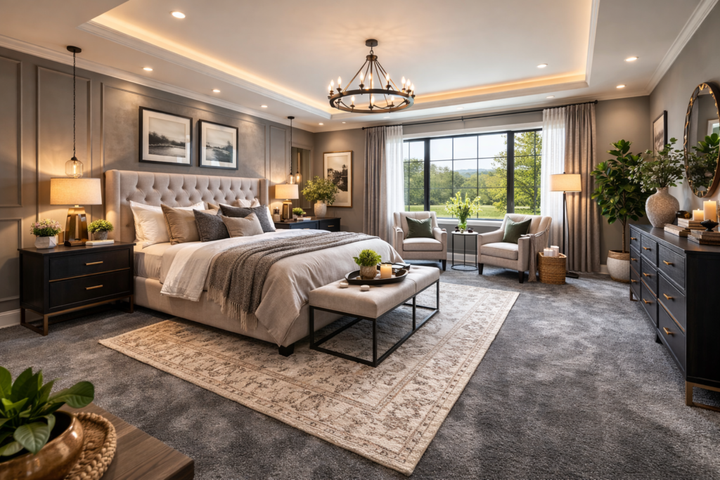 If you’re designing around gray carpet bedroom ideas master, choose a greige wall tone instead of blue-gray. It softens the entire space.
