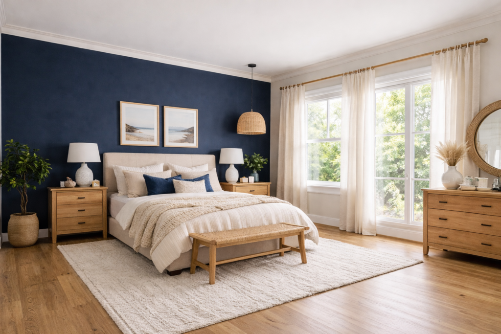 Coastal is evolving. It’s no longer just seashells and light blue. 2026 coastal is deep navy mixed with beige and sand.