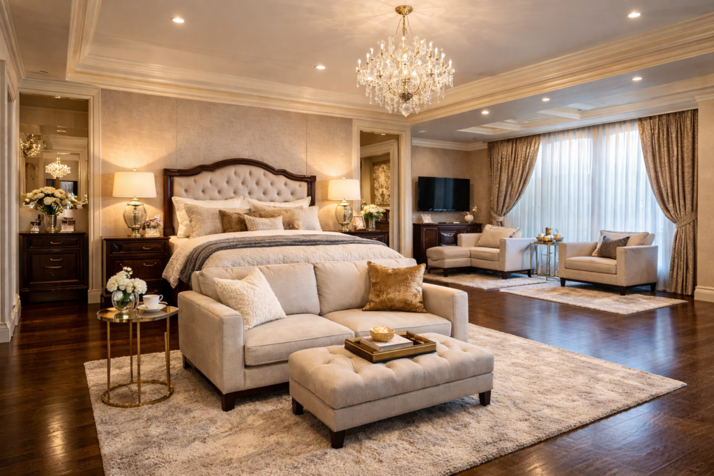 A Bedroom With Sitting Area is one of the best ways to turn your bedroom into a relaxing personal retreat. Instead of just a place to sleep, your bedroom becomes a space for reading, watching TV, relaxing with your partner, or simply enjoying quiet time. Whether you have Huge Bedrooms, a Big Mansion Bedroom, or a compact layout, adding a Bedroom Seating Area instantly elevates comfort and style.