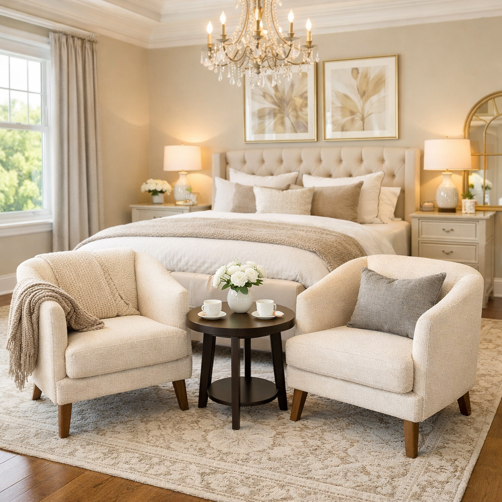 A Two Chairs Sitting Area Bedroom creates a stylish Bedroom Seating Area.