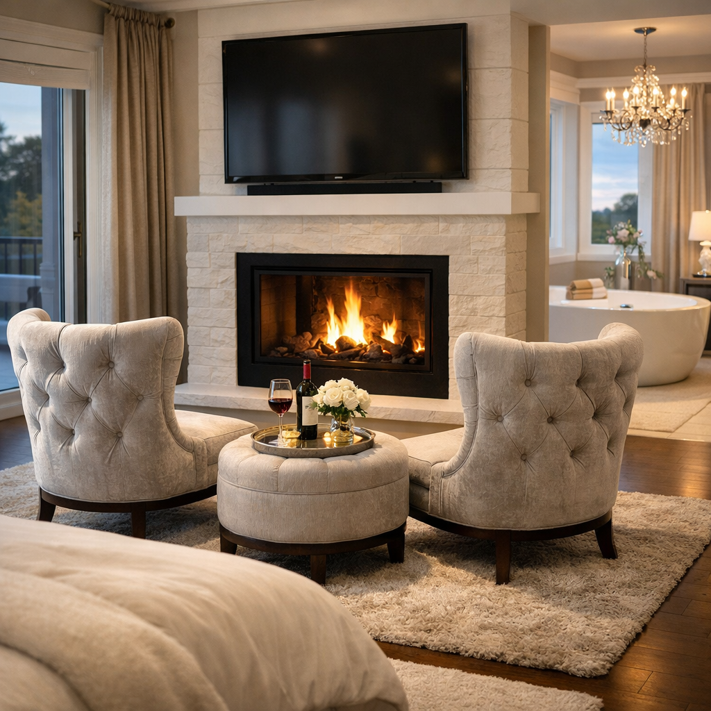 Nothing feels more luxurious than a Bedroom Fireplace with comfortable seating. A Bedroom Fireplace Seating Design instantly creates a Romantic Room vibe.