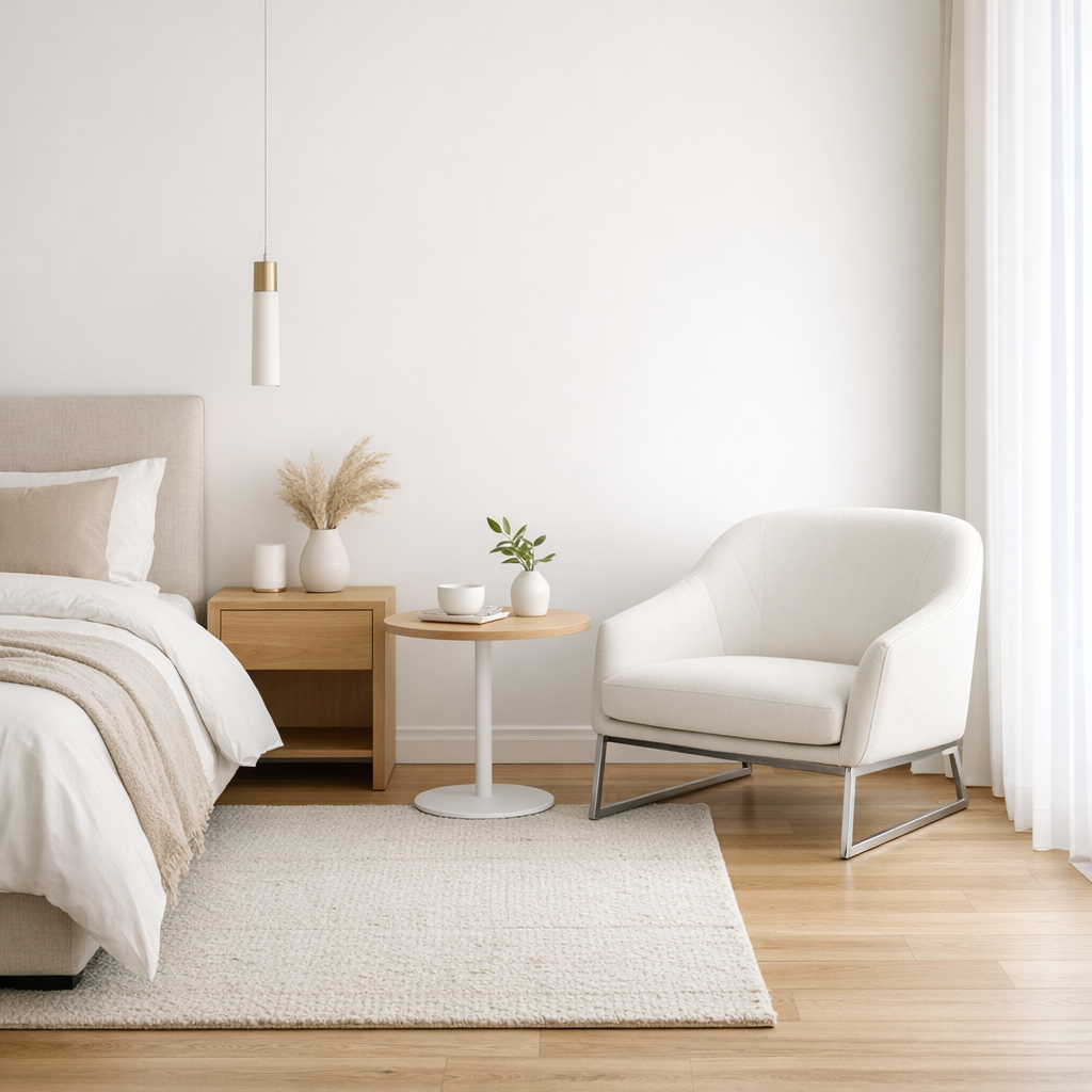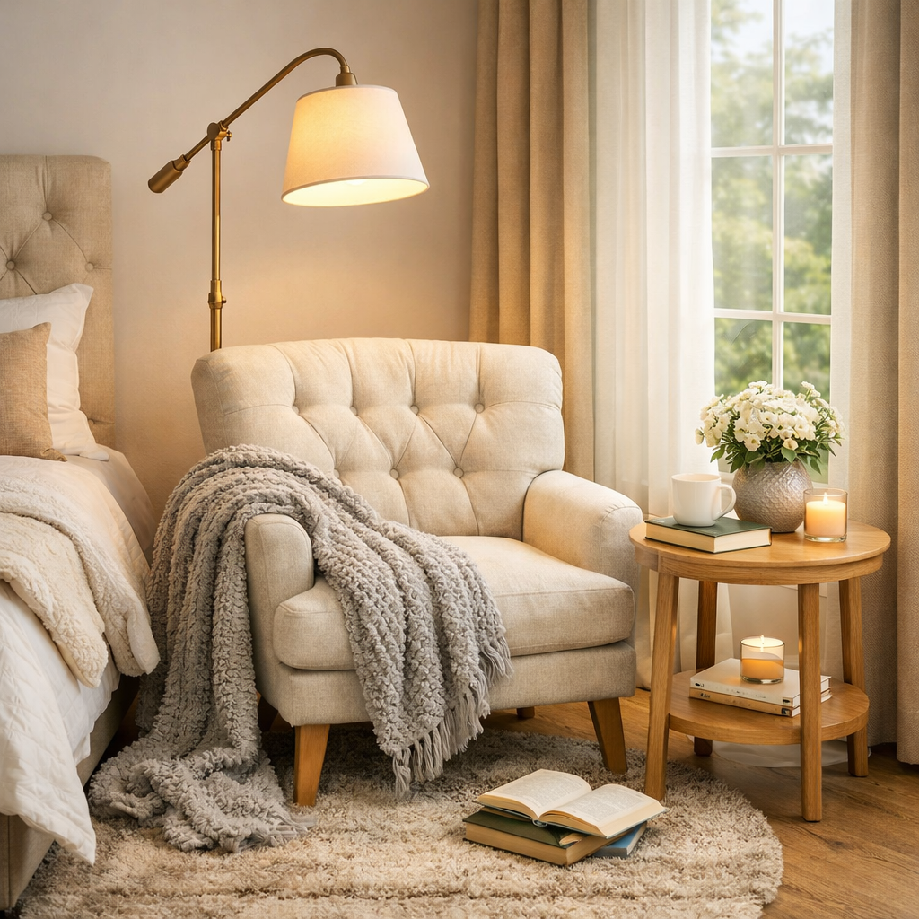 Add soft lighting and warm textures to create a Serene Bedroom Seating Retreat.