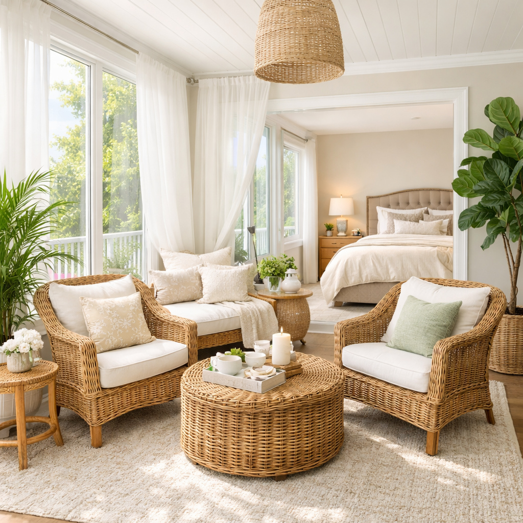 Add wicker chairs, plants, and light fabrics for a relaxing resort vibe.