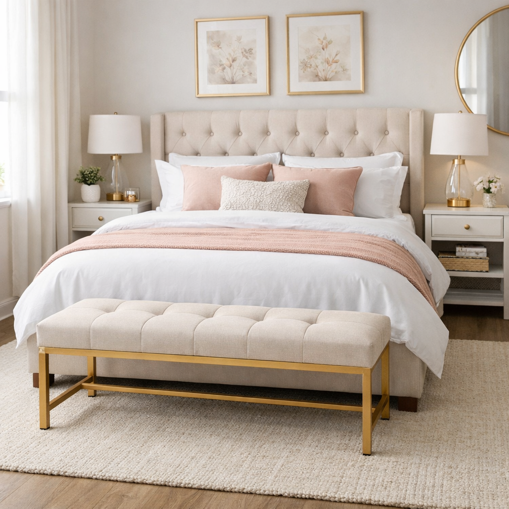 9. Add a Bench or Ottoman at the Foot of the Bed 🪑