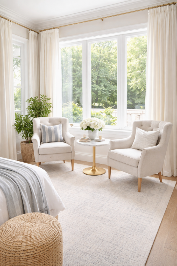 Place chairs near the window with a small table to create a Bright Bedroom Window Lounge.