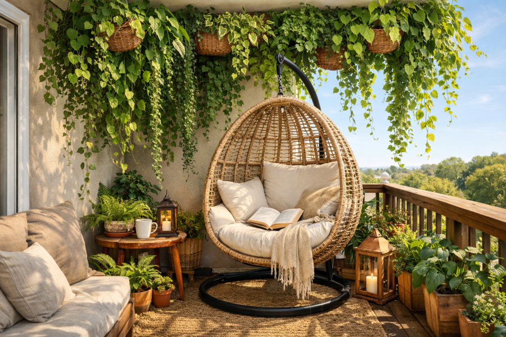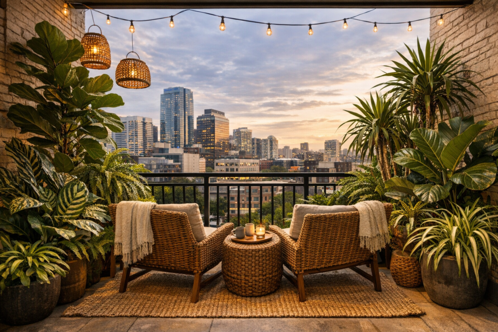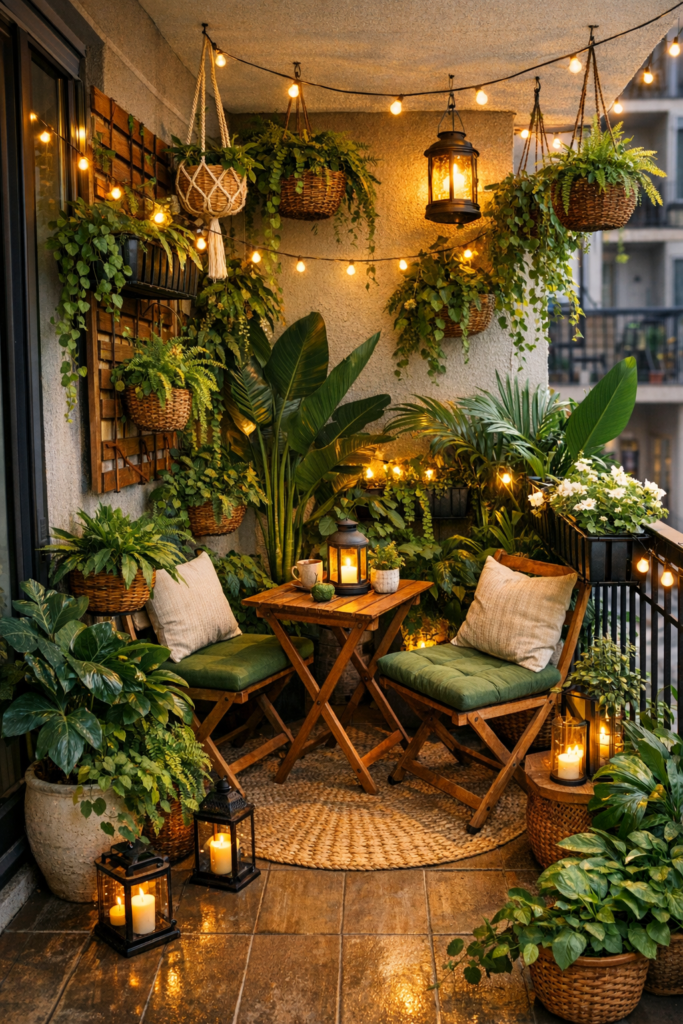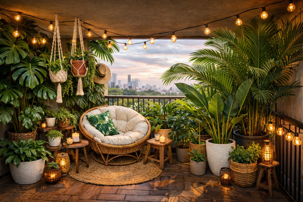 Whether you prefer modern balcony decor, simple balcony decoration, or tropical balcony aesthetics, the key is layering plants with comfortable seating and thoughtful lighting.