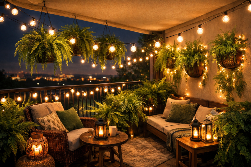 2. Fern Jungle Balcony With Apartment Balcony Lights