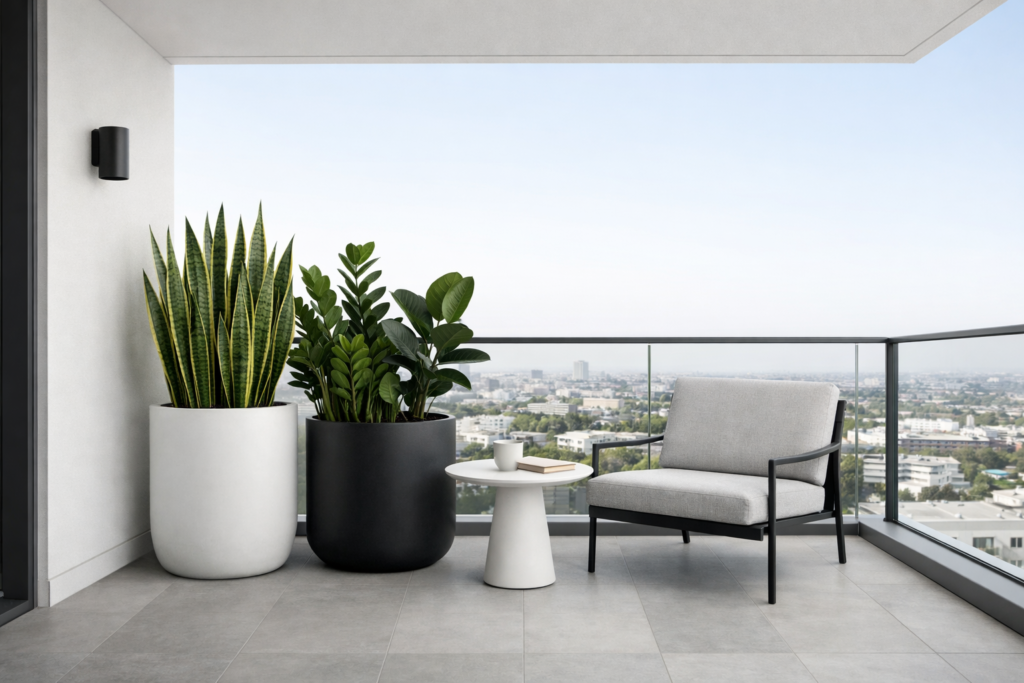 3. Snake Plant & ZZ Plant Minimalist Balcony