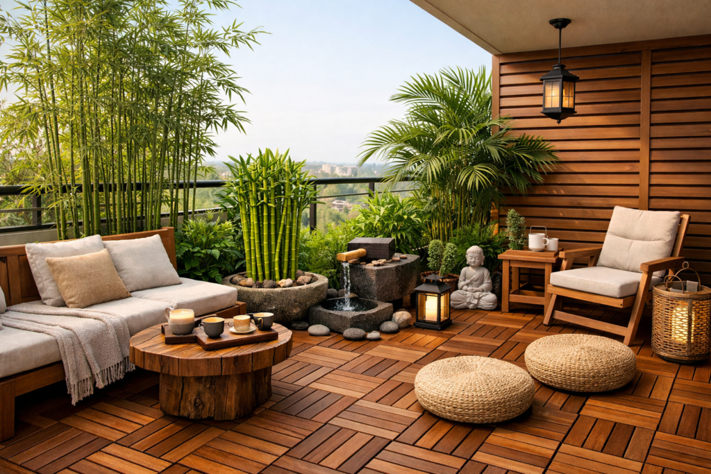 A Japandi balcony design looks peaceful and natural with bamboo plants.