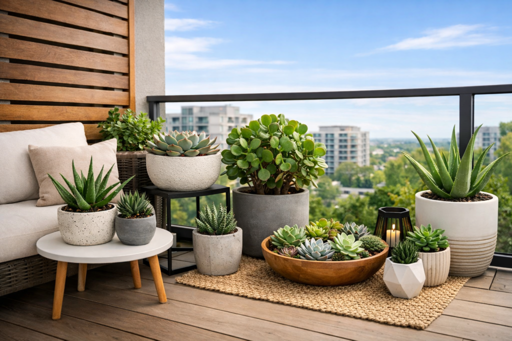 For sunny balconies, succulents create a low-maintenance jungle look. Try Aloe Vera, Jade Plant, Echeveria, and Haworthia.